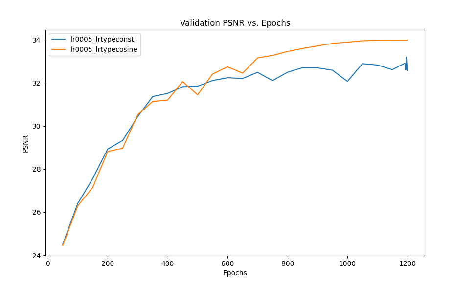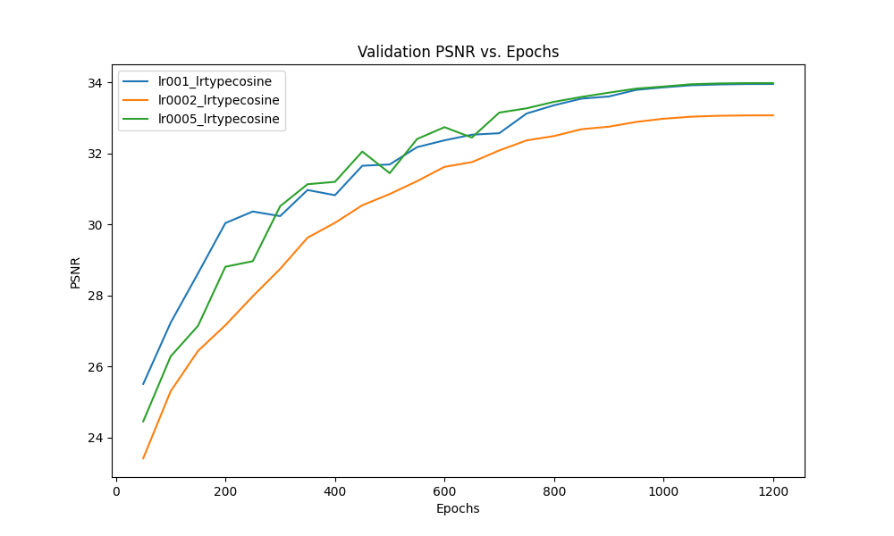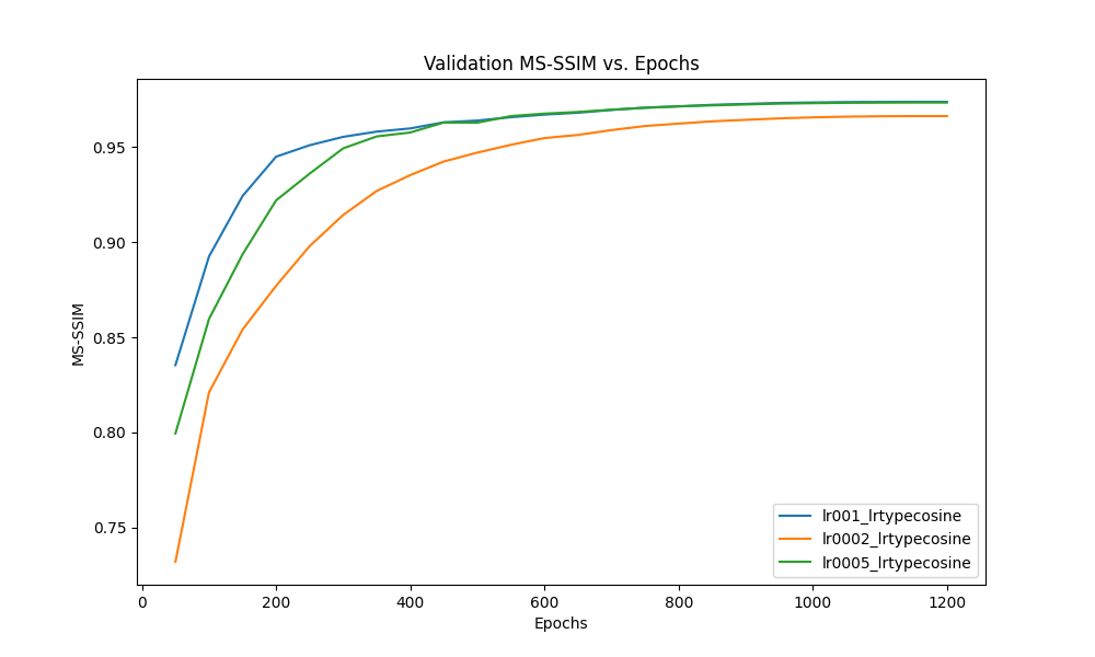 One of the hyperparameters we attempted to study was the learning rate. We changed the default learning rate from 0.0005 to 0.001 and 0.0002 for 1200 epochs while using cosine annealing. The performance is measured using two metrics - MS-SSIM and PSNR.