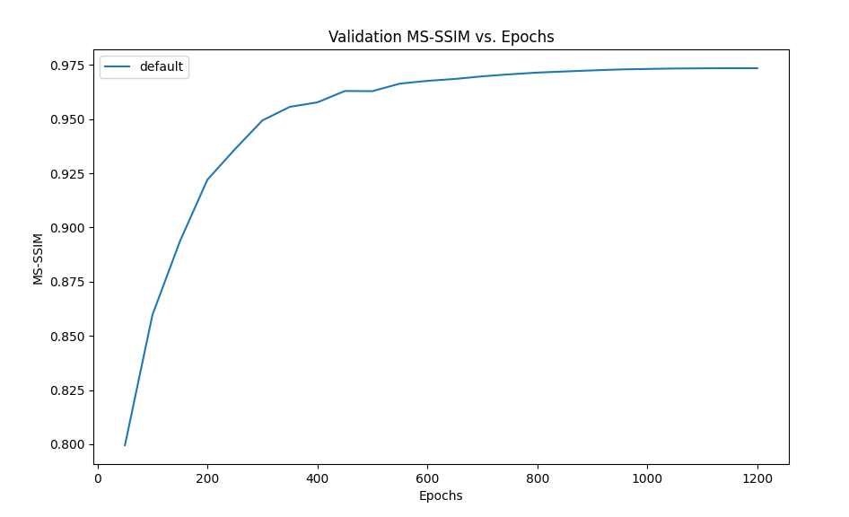 We observe a significant improvement in performance when training for higher epochs. In the figure below, after 300 epochs the PSNR is 30.5, 32.7 after 600 and 33.98 after 1200. However performance starts to saturate around 1000 epochs and we don’t see any significant improvement later. We recommend using 300 epochs for quick prototyping and testing if one is short on time, as the MS-SSIM scores do not show much improvement post this mark (0.94 at 300 epochs, 0.97 at 1200).
