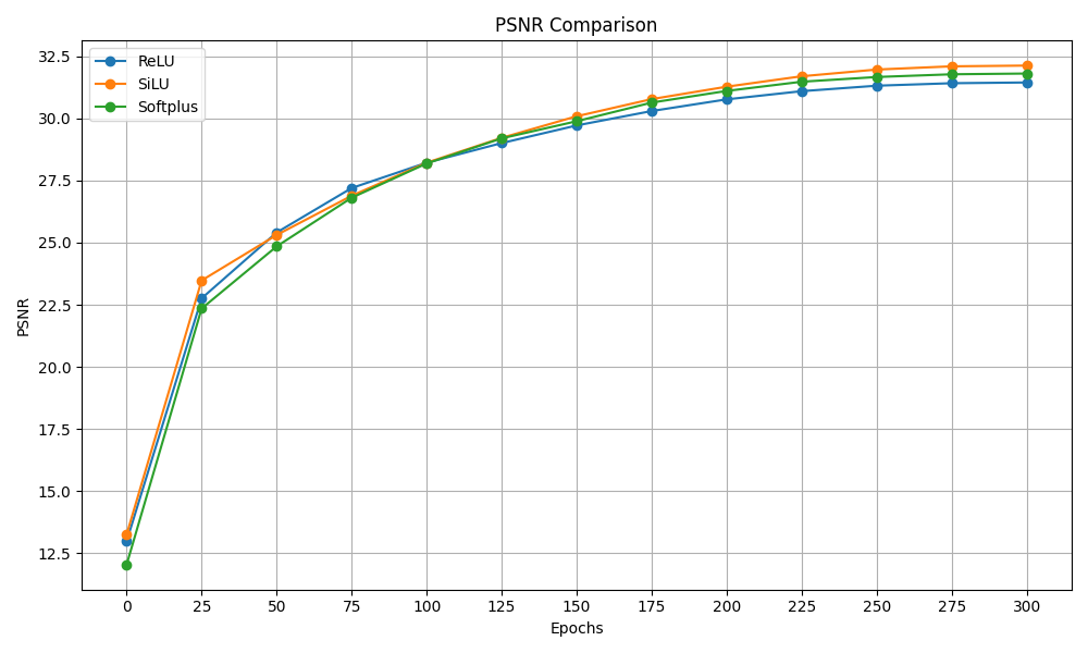 To understand the differences that the activation function makes, we tried to train the model on the “Big Bunny Dataset” with the same hyperparameters as in the reproduction section but for a shortened time, 300 epochs, changing the activation functions. We tried ReLU, SiLU and softplus.