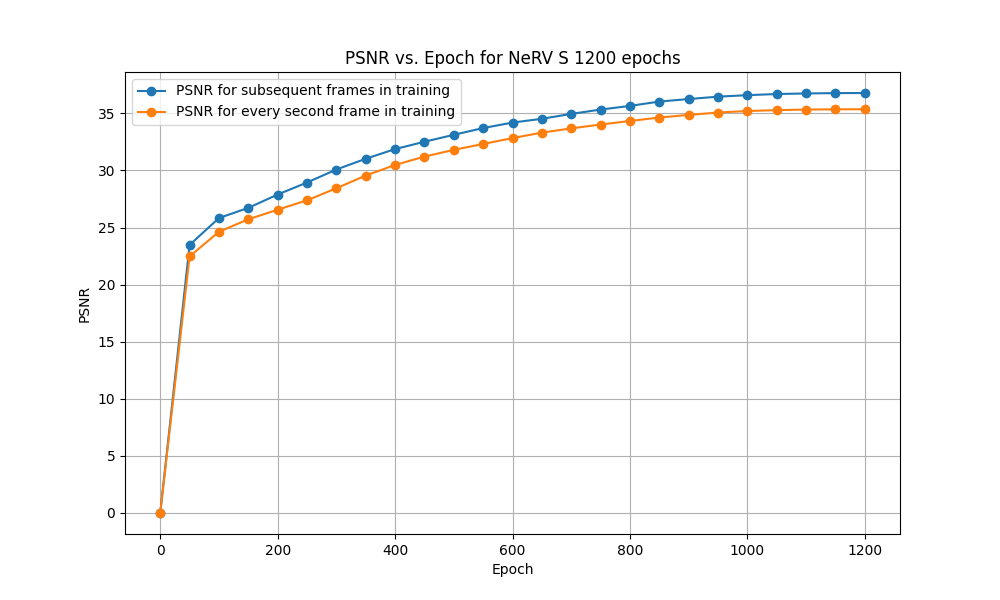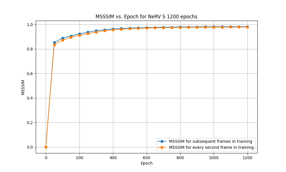 Now both scenarios for NeRV-S (1200 epochs) of subsequent frames and every second frame training were analysed quantitatively. This was done by creating graphs for PSNR and MS-SSIM with values stated after every 50 epochs. These graphs can be seen in Figure 8 and Figure 9.