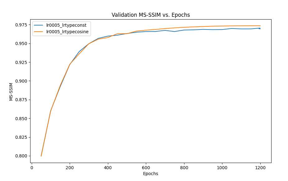 When we decrease the learning rate to 0.0002, the final MS-SSIM indicates slightly worse performance after training for 1200 epochs in both training and validation. It seems this learning rate is not high enough to cause a significant change in weights.
